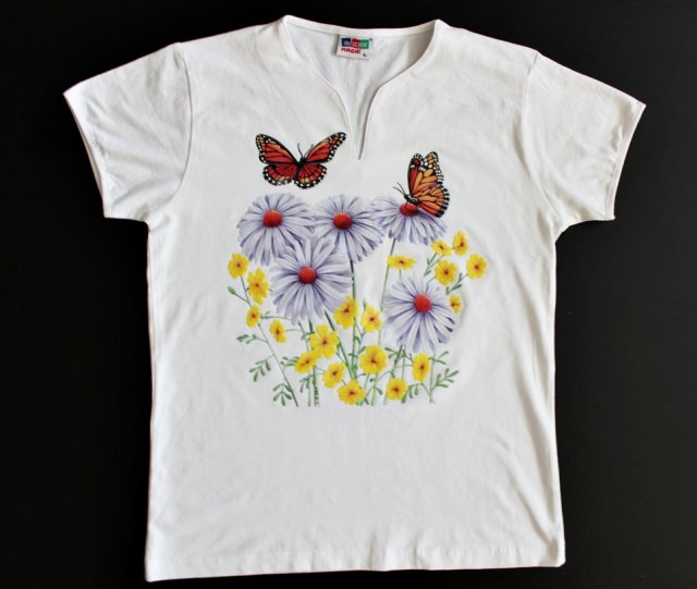 Biała bluzka z ślicznym wysokiej jakości kolorowym nadrukiem. Pod nadrukiem sygnatura.