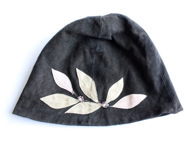 Niezwykle oryginalna, luksusowa czapka marki Augustinus. Kolor to stonowany grafit na granicy brązu. W mojej ocenie wykonana z zamszu. Posiada podszewkę.