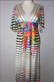 oryginalna, przepiękna, bardzo kobieca długa sukienka vintage z lat 70-tych, materiał śliski w dotyku, z połyskiem, nadruk wielokolorowych kwiatów, krótki szeroki rękawek z rozcięciem, odcinana pod biustem, na plecach zapięcie na suwak