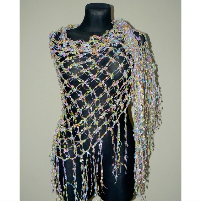 Nietuzinkowa ozdoba na ramiona. Trójkątna chusta misternie spleciona z pastelowych kolorowych nitek. Piękna i oryginalna.
