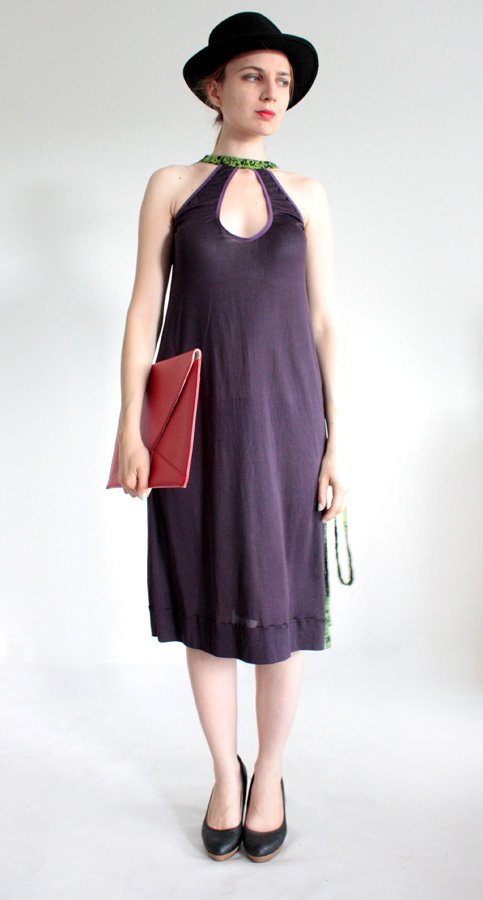 Niezwykle oryginalna, ciemnofioletowa sukienka z przyjemnego w dotyku, uciągliwego materiału. Posiada dwie wstążki, dzięki którym można modyfikować fason sukienki.