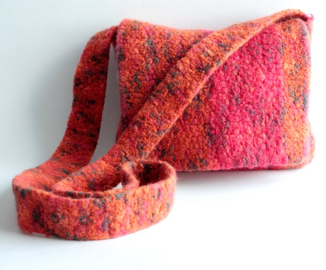 Torba w przelewanych odcieniach pomarańczu i czerwieni. Wykonana z bardzo gęsto tkanej welny, dzięki czemu dobrze trzyma formę.