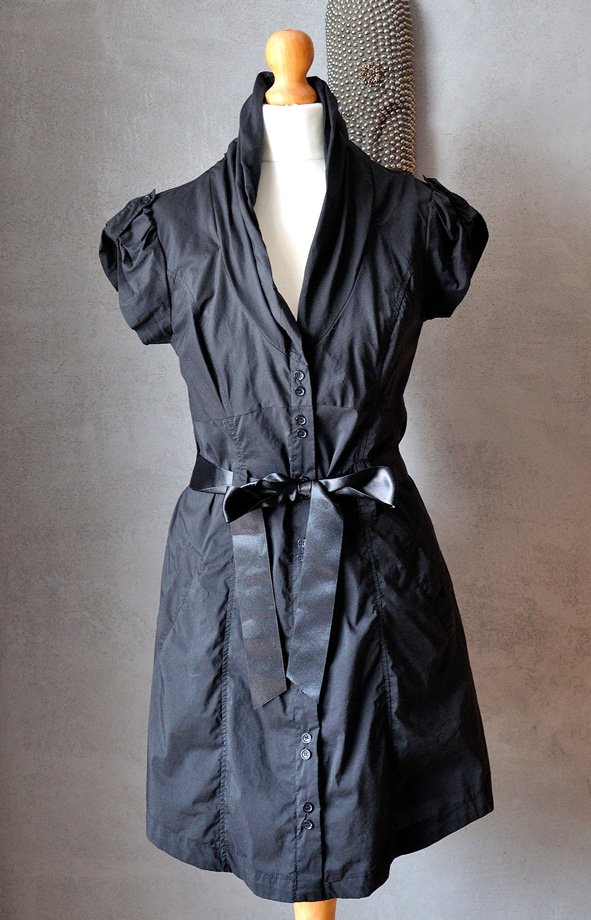 Pięknie skrojona i dopasowana (dzięki pionowo biegnącym szwom i zaszewkom). W talii szlufki i czarna satynowa szarfa do wiązania (można też założyć np. pasek z ćwiekami).