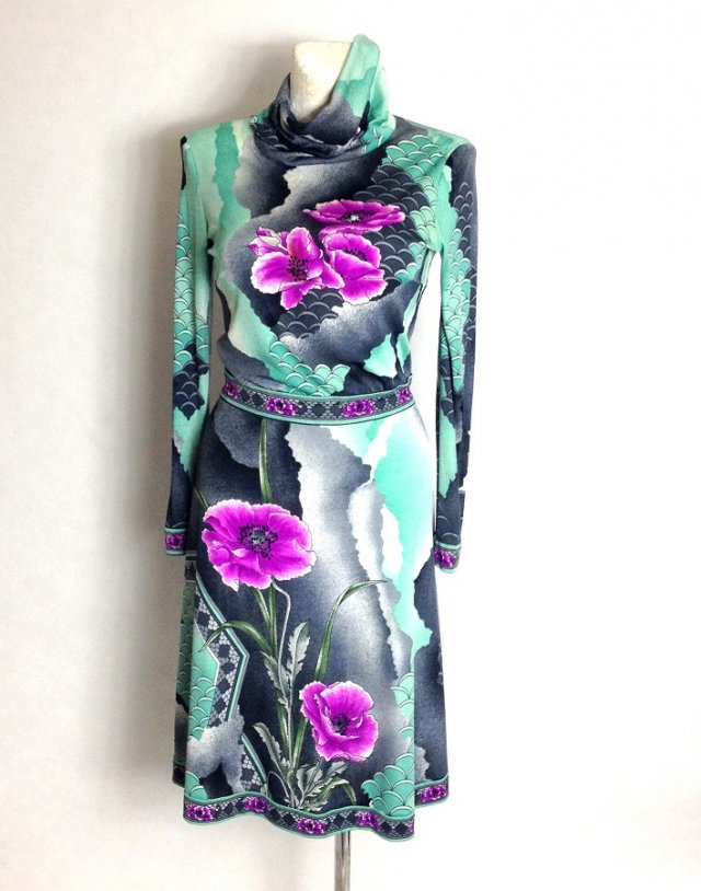 Niezwykle barwna kobieca sukienka z golfem wykonana z delikatnie elastycznej , zwartej tkaniny, bajeczny kwiatowy print w towarzystwie nieprzypadkowej gamy kolorystycznej ; delikatnej gdzieniegdzie rozmytej sepia szarości,ciemniejszej szarości fioletu, turkusowej zieleni,ciemniejszej zieleni.