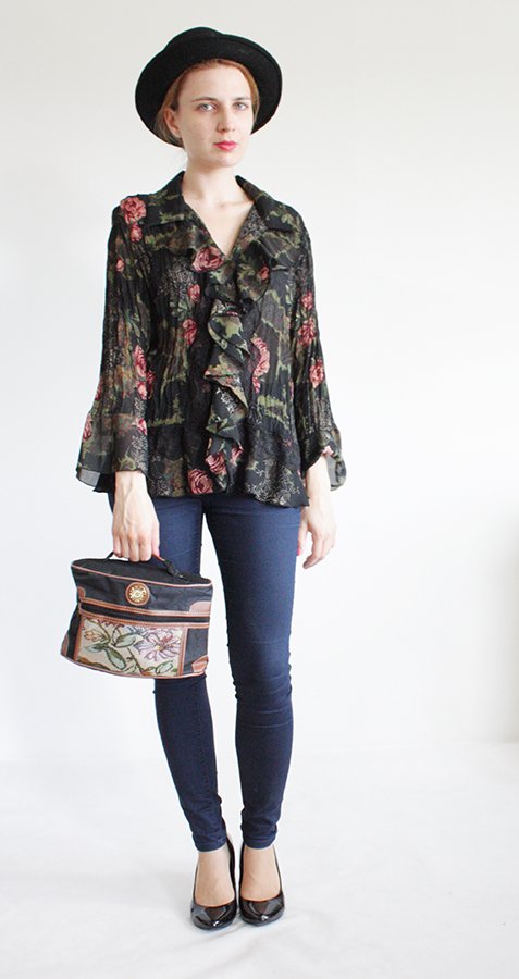 Oryginalna bluzka z mnóstwem detali, wykończona czarną koronką. Wykonana prawdopodobnie z wiskozy.