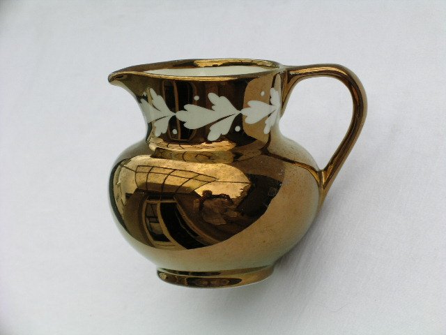 Porcelanowy mlecznik w klasycznym kształcie i z niesamowitym, głębokim, miedzianym, bogatym złoceniem. Ręcznie malowany. Wewnątrz porcelana ecru. Piękna sygnatura numeryczna od Greys Pottery, England. Pękatość 8; szer.9,5; wys.8 cm. Stan zachowania bardzo dobry. Wielce efektowny :)