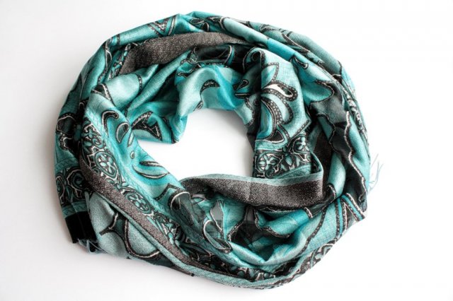 Piękny, wytłaczany szal w odcieniach blękitu, miejscami oprószony bardzo delikatnym srebrem.