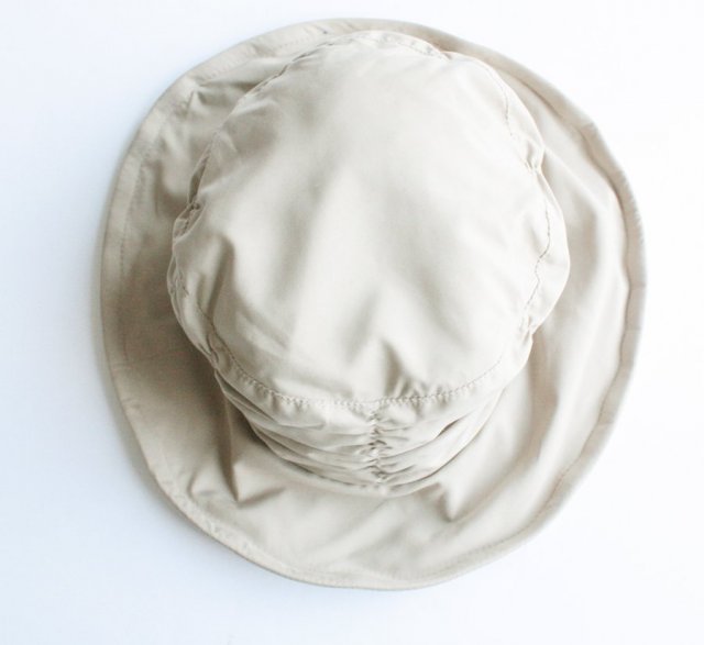Oryginalny kapelusz w kolorze ciepłego beżu. Posiada podszewkę. Wokół głowy szeroka gumowa taśma.