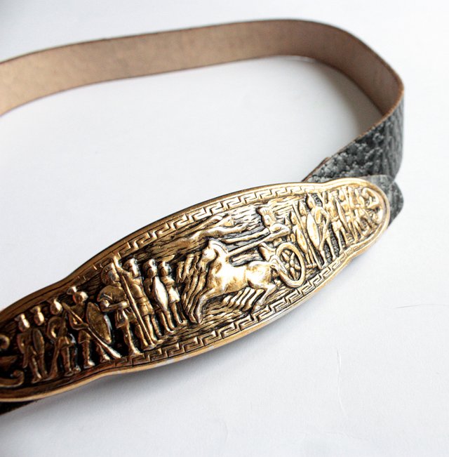 Pasek z niezwykłą, ozdobną klamrą, wykonany w mojej ocenie ze skóry. Kolor czarny. Klamra-stare złoto.
