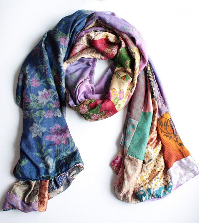Niezwykły szal złożony z mnóstwa różnych kawałków materiału. Z jednej strony patchwork, z drugiej - cieniowana tkanina.