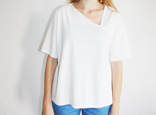 T-shirt z asymetrycznym dekoltem. Materiał to prawdopodobnie poliester.