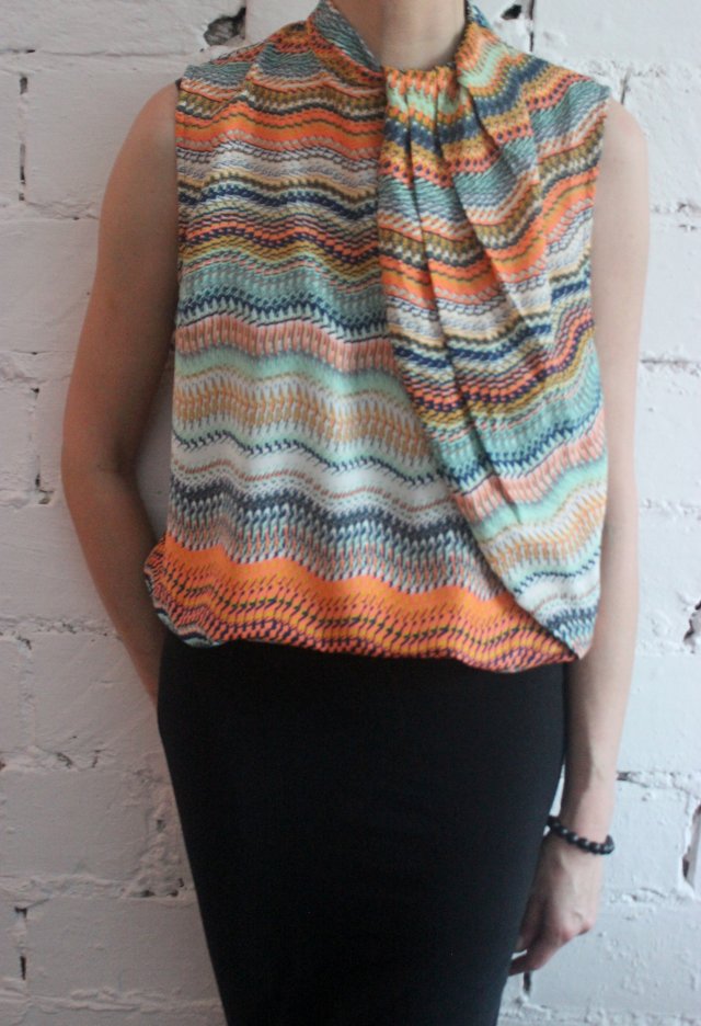 Bluzka z żabotem. Tył zapinany na zamek. Firma Nikka. Rozmiar 44/XXL. Wymiary: obwód biustu-55cmx2 (mierzony od pachy do pachy), obwód bioder-58cmx2, długość przodu bluzki-70cm, długość tyłu bluzki-79cm. Skład materiału: 100% poliester.