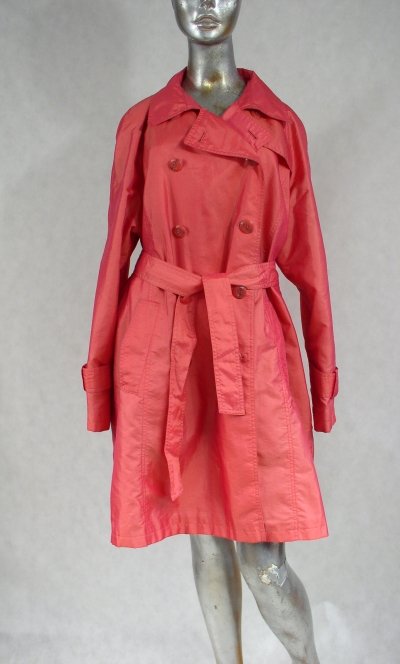 Płaszcz wiosenno-letni,firmy Nina Holthoff.Materiał 53% nylon + 47% polyestre z lekkim połyskiem.Podszewka w kolorze płaszcza i w paski.Rozmiar 44.W wewnątrz kieszeń zapinana na guzik.Przód zapinany na guziki.Dwie pionowe kieszenie,chowane do środka,przykryte klapką.Rękaw reglan + poduszki,długi na końcu pasek zapięty na guzik.Z tyłu na środku rozporek.W pasie wiązany pasek.Stan bardzo dobry.Długość 94 cm.pod pachami 126 cm,obniżone.Kolor malinowy.