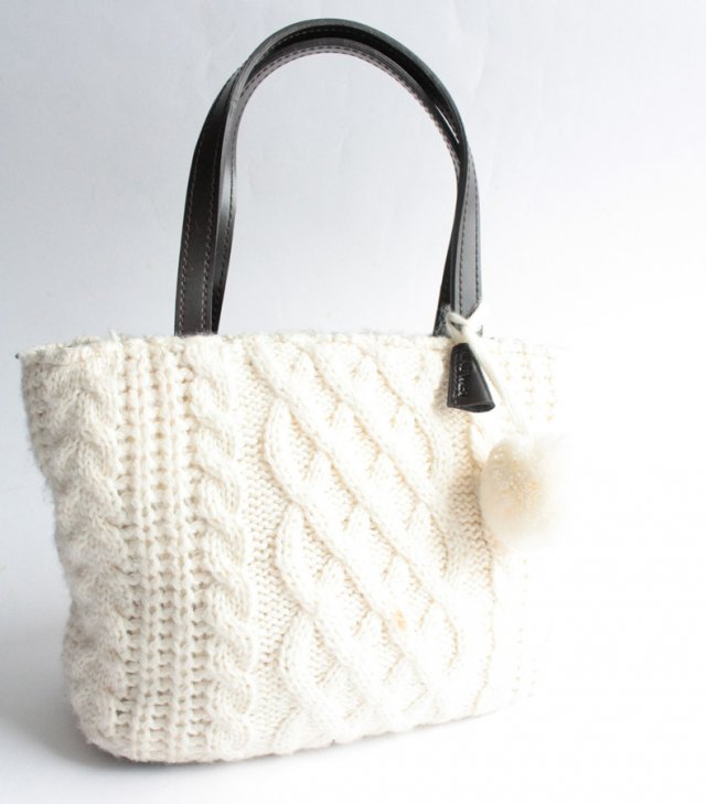 Kremowa dzianinowa torebka marki NINE WEST ozdobiona uroczym pomponem, który można w razie potrzeby usunąć. Wewnątrz urocza podszewka w kratę. Torba zapinana jest na zatrzask. Można dołączyć długi pasek lub łańcuszek (uchwyty ukryte wewnątrz).