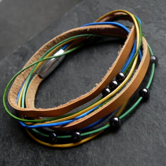 Bransoletka w stylu boho wykonana tylko w JEDNYM EGZEMPLARZU, z różnorodnych rzemieni ze skóry naturalnej, kuleczek hematytu oraz elementów w kolorze srebrnym.. Bransoletka będzie pasowała na nadgarstek 16 cm.
