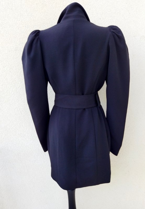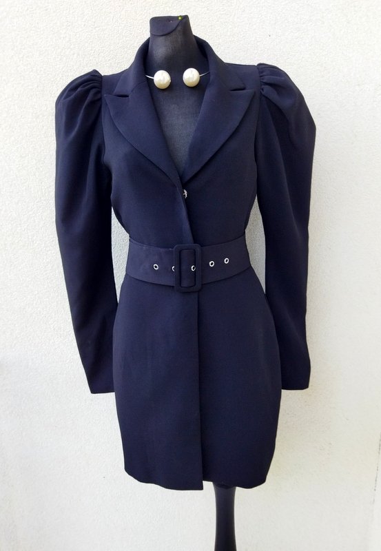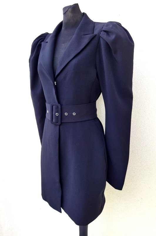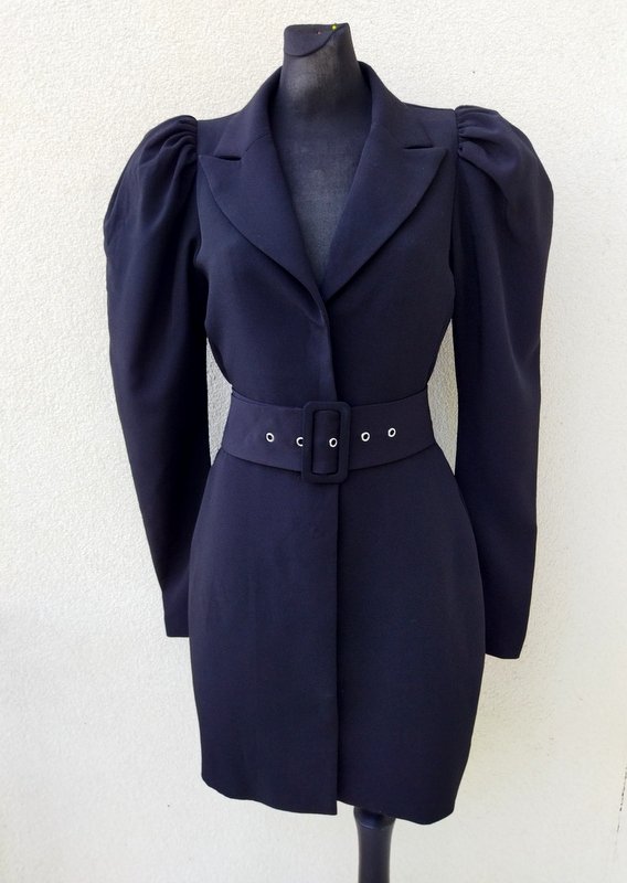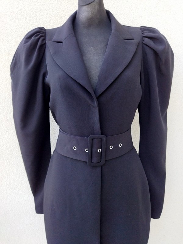 Nietuzinkowa garniturowa świetnej jakości sukienka z obszernymi rękawami z tkaniny poliestrowej w kolorze głębokiej czerni . Ozdobą sukienki są oryginalne rękawy mocno bufiaste w główce zwężane do dołu. Taliowana, z kołnierzem z rewersami, w talii pasek z klamerką pokrytą tkaniną. Zapinana od wewnątrz na mocne metalowe haftki. Całość na podszewce.