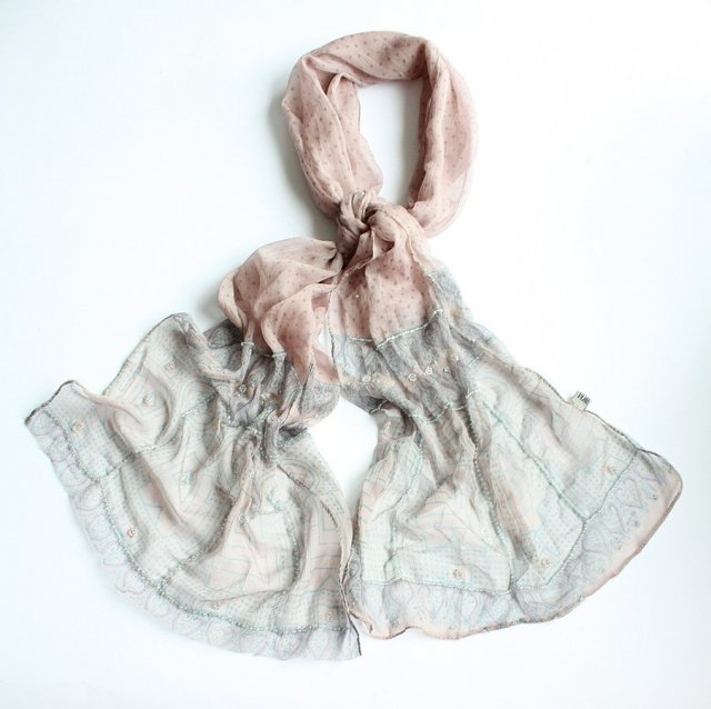 Zwiewny, cieniutki szal w dyskretne wzory, ozdobiony przezroczystymi maleńkimi koralikami. Ten szal będzie niezwykle kobiecym dodatkiem, który urozmaici Twój strój i doda mu lekkości. Tkanina jest miękka, delikatna w dotyku, matowa. W mojej ocenie jest to jedwab naturalny, ale szal nie ma metki ze składem.