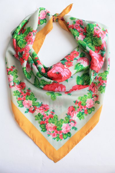 Różana chusta marki NOA NOA. Tło: bardzo jasny seledyn. Materiał oceniam na jedwab.