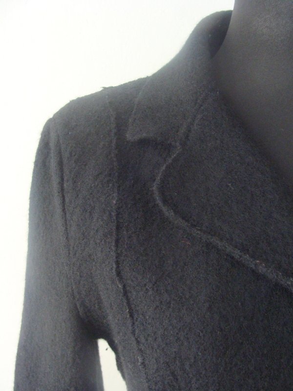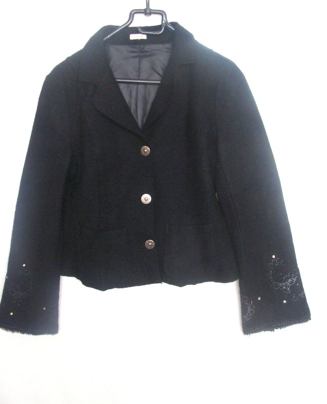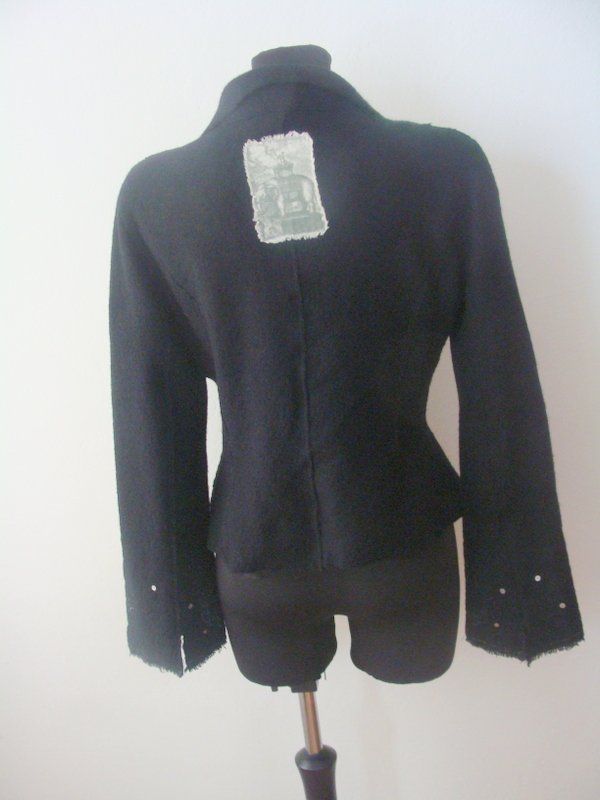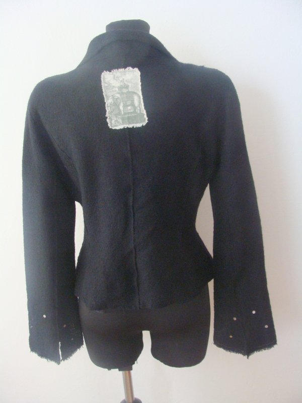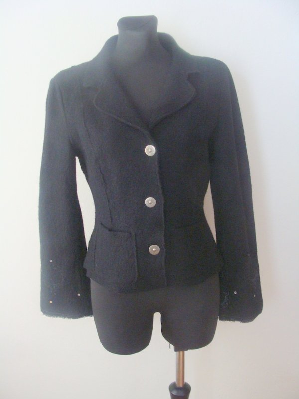 Ciepła marynarka z wełnianej tkaniny w czarnym kolorze, z fakturą drobnych boucle, ze szwami wykończonymi na surowo. Taliowana, z kołnierzem z rewersami, z dwiema naszywanymi kieszeniami, z rękawami poszerzanym u dołu ze strzępiastym wykończeniem, zdobionymi srebrnymi malunkami. Na plecach aplikacja z tkaniny. Zapinana na trzy metalowe grawerowane guziki w srebrnym kolorze. Całość na podszewce.