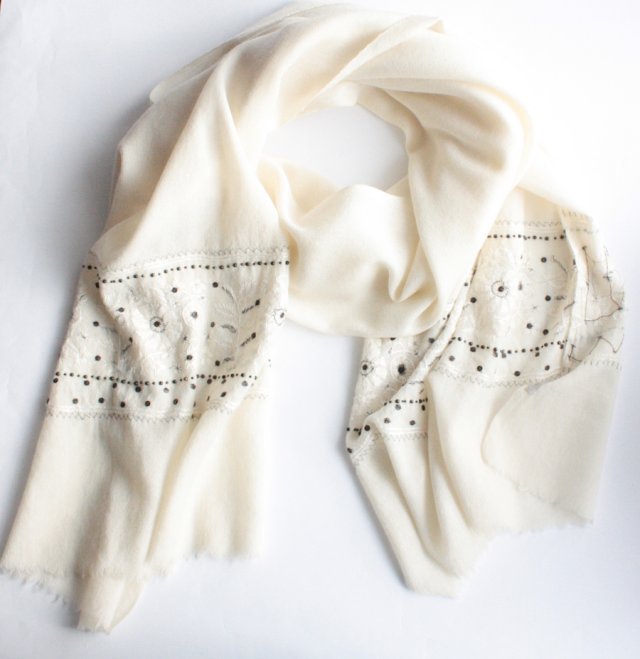 Absolutnie wyjątkowy miękki szal marki NOA NOA ozdobiony subtelnymi haftami i różnymi koralikami. Szal jest z tego względu jednostronny.