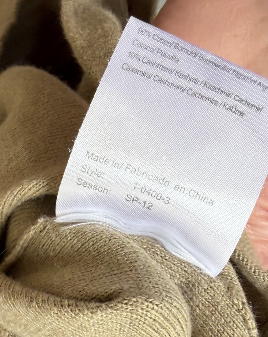 NOA NOA - 10% kaszmir 90% bawełna . Piękne guziczki z lekko szarawej masy perłowej . Długie rękawy . Sweterek krótki , miękki . Kolor oliwkowy . Rozmiar M. Pachy 46 dół 44 długość rękawa od ramienia 65 cm długość sweterka 51 cm Ramiona 40 cm Stan zachowania bardzo dobry, minimalne ślady użytkowania . Metki : firmowa i ze składem obecne . Wymiary podane mierzone na płasko. Kolor najbardziej zbliżony do tego w realu na zdjęciu trzecim i czwartym .