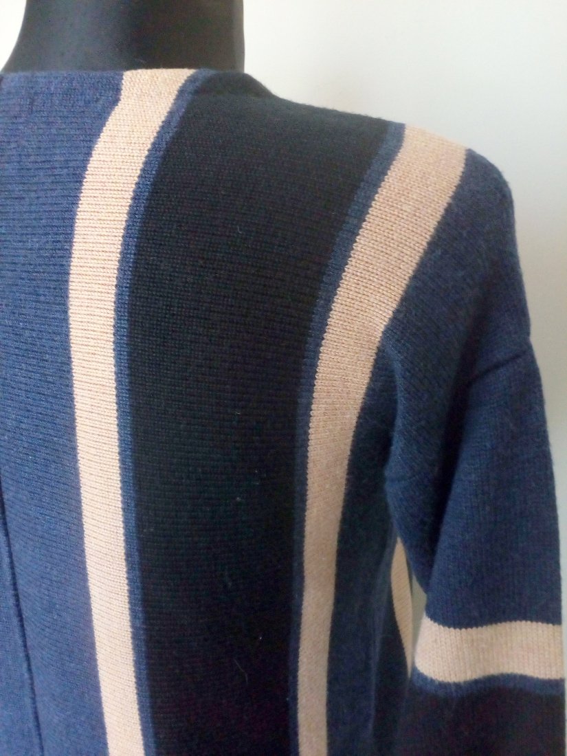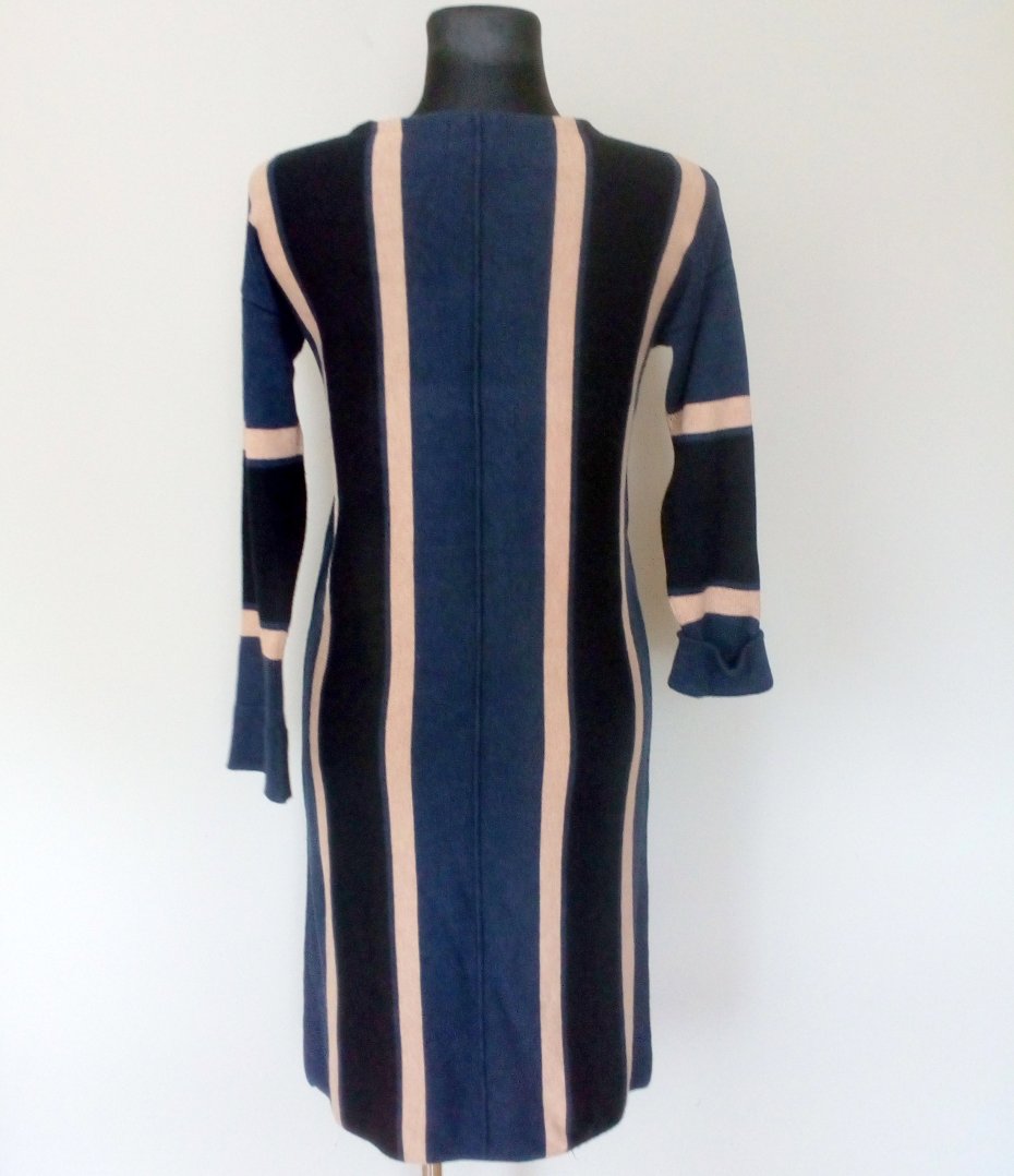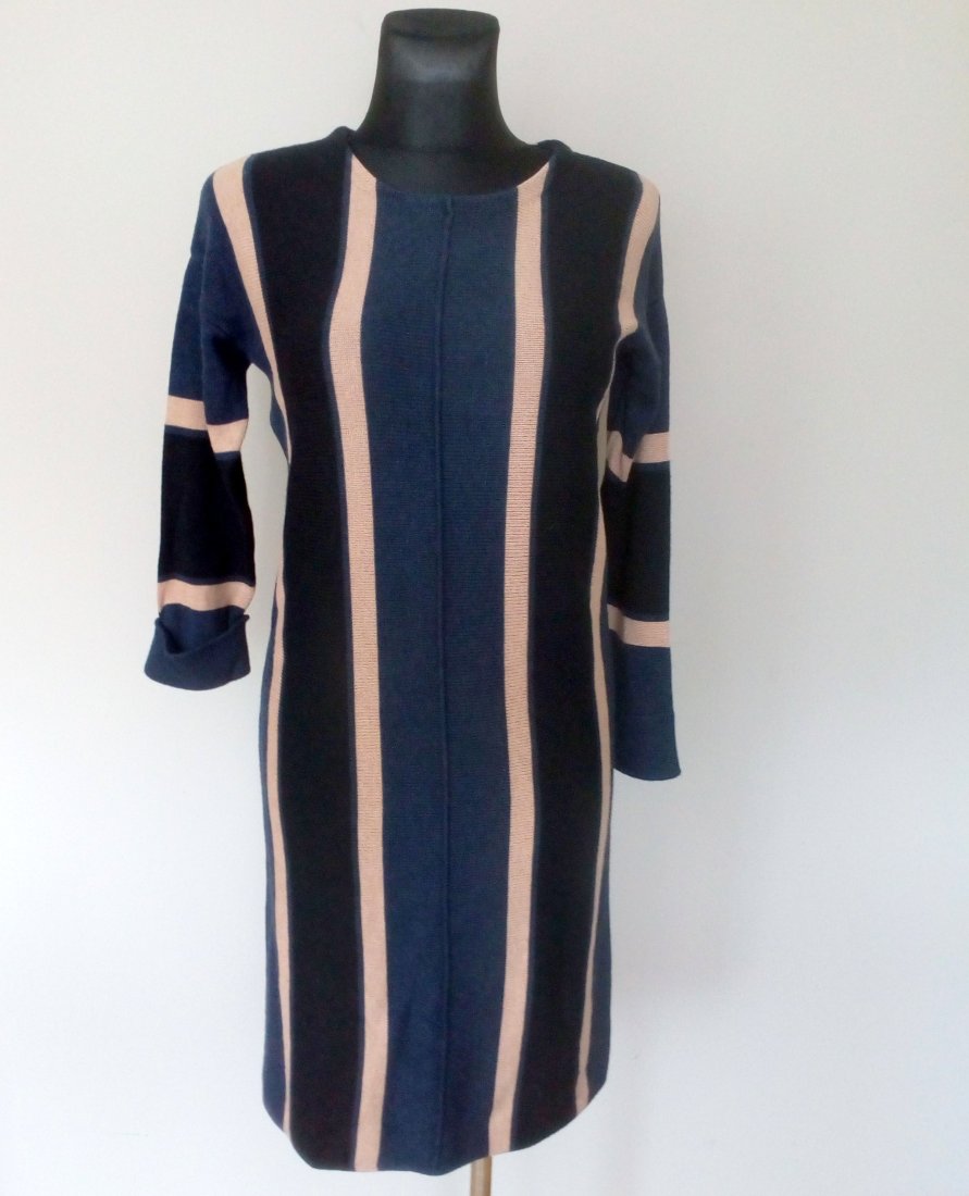 ładna, dzianinowa sukienka o bardzo dobrym składzie gatunkowym, kolorystyka - granat, beż i czarny, rękaw obniżany