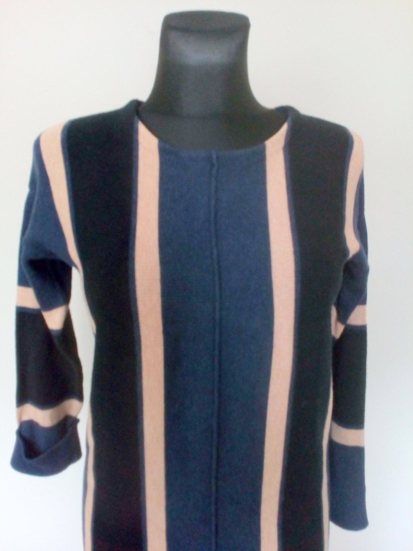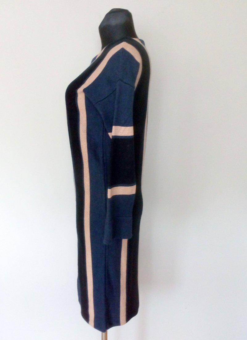 ładna, dzianinowa sukienka o bardzo dobrym składzie gatunkowym, kolorystyka - granat, beż i czarny, rękaw obniżany