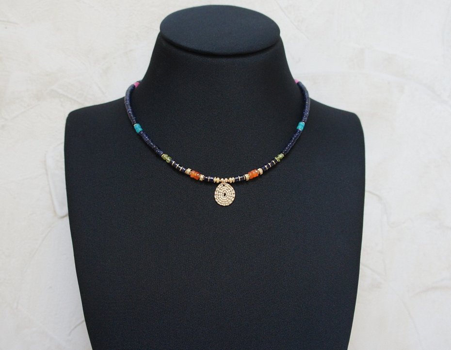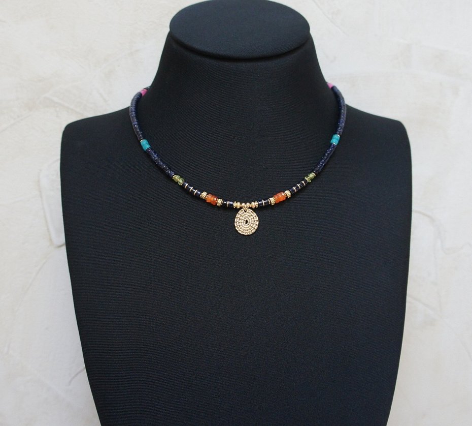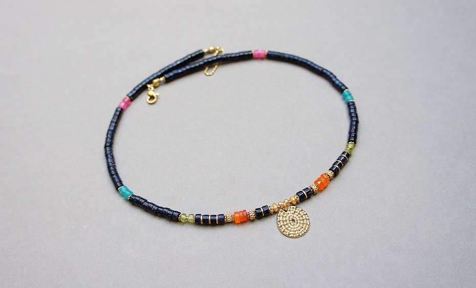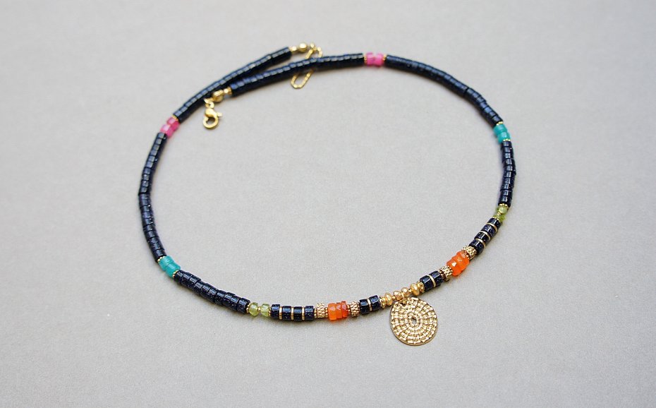 Krótki naszyjnik wykonany w całości z pozłacanej stali szlachetnej oraz kamieni - talarki nocy kairu [4 x 2mm; kamienie mienią się jak gwiazdy], talarki matowego hematytu [4 x 2mm], talarki jadeitu [4 x 2mm], nieregularne talarki karneolu [ok. 5 x 2mm], nieregularne talarki oliwinu [3 x 2mm], fasetowanych oponek matowego, platerowanego hematytu [3 x 2mm]. Naszyjnik o długości ok. 43,5cm. Biżuteria ozdobnie zapakowana.