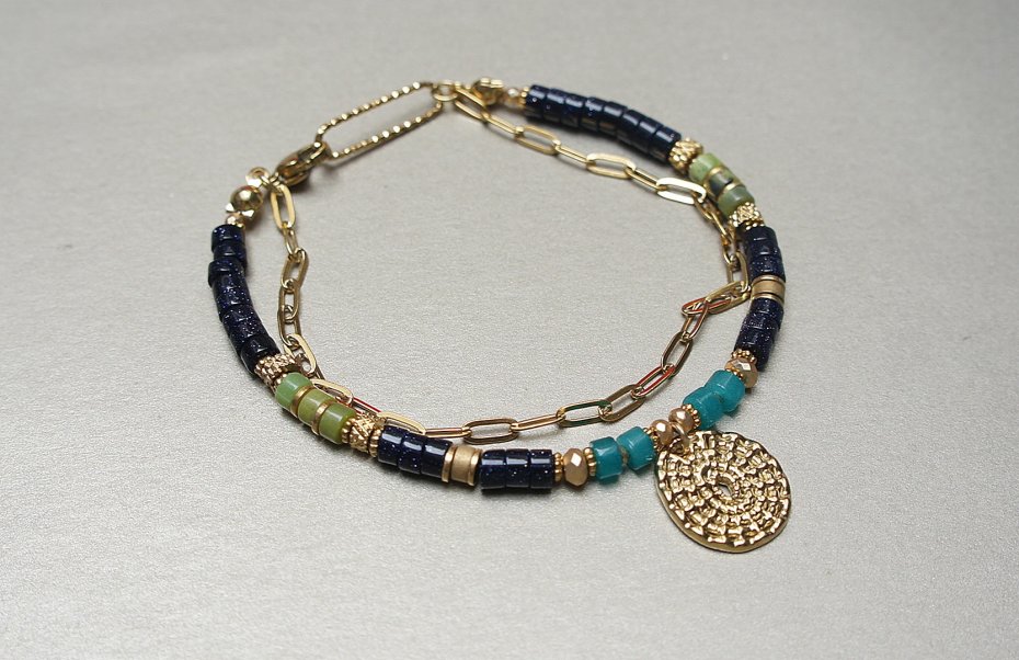 Bransoletka wykonana ze stali szlachetnej oraz kamieni - talarków nocy kairu [4 x 2mm; kamienie mienią się jak gwiazdy na niebie], talarków matowego hematytu [4 x 2mm], talarków jaspisu [4 x 2mm], talarków jadeitu [4 x 2mm]. Całkowita długość bransoletki: ok. 19,5cm. Biżuteria ozdobnie zapakowana.