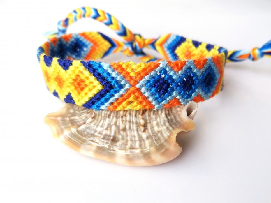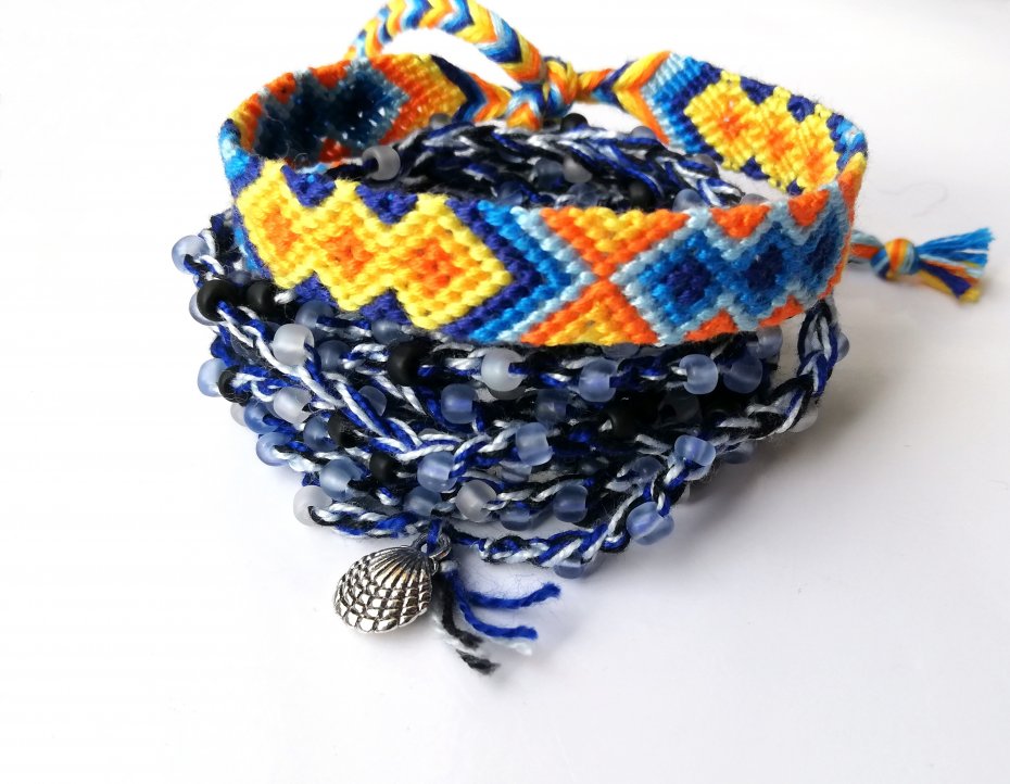Ręcznie pleciona bransoletka z bawełnianych nici. W pięknych kolorach - dwa odcienie żółtego, pomarańczowy i niebieski w 3 odcieniach*.