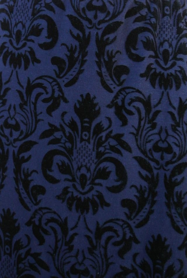 Na granatowym tle czarne,aksamitne wzory. Spódnica dosyć elastyczna,w pasie guma.