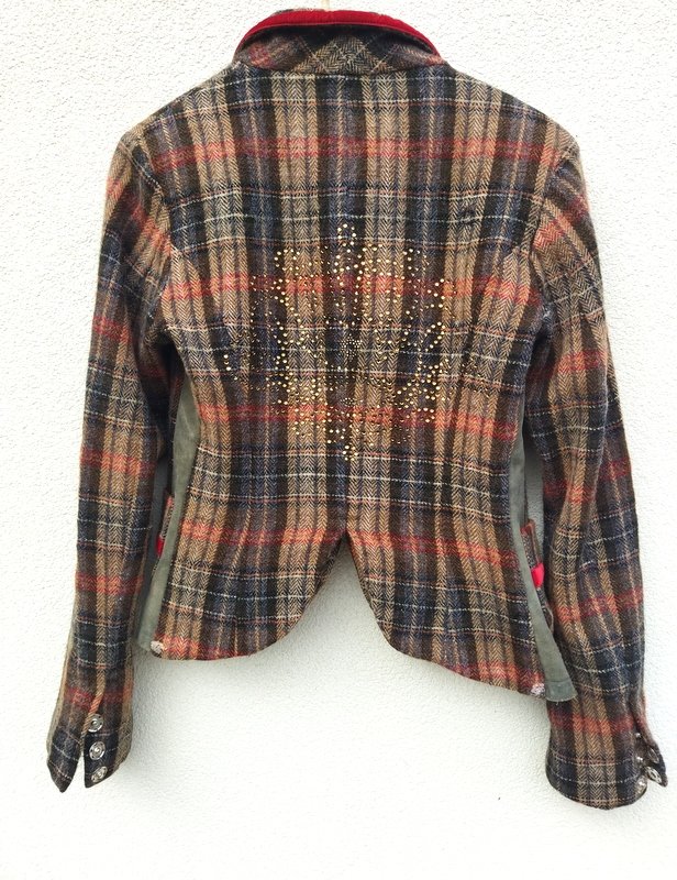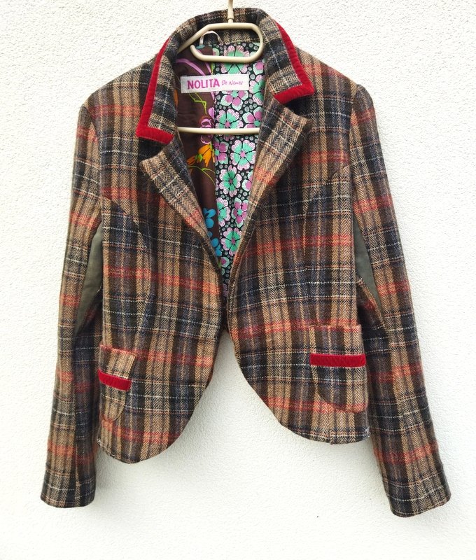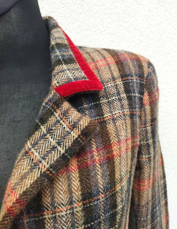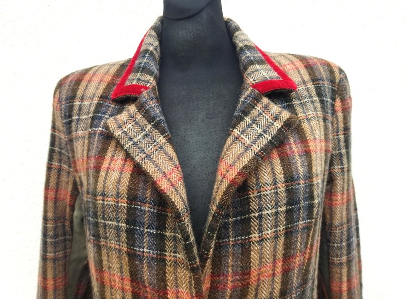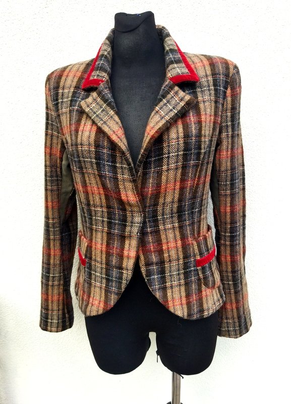 Zgrabna marynarka z wełnianej tkaniny wzorem w kratę w kolorystyce beżu, brązu, szarości i czerwieni, z czerwonymi aksamitnymi lamówkami, po bokach wstawki z naturalnej skóry w szarym kolorze. taliowana z kołnierzem z rewersami, z dwiema naszywanymi kieszonkami, z rozcięciami na brzegach rękawa zapinanymi od wewnątrz, z zaokrąglonymi połami przodu i zaokrąglonym rozcięciem z tyłu u dołu, zdobiona na plecach dzetami w miodowym kolorze. Zapinana na jedną mocną zatrzaskę. Całość na eleganckiej wzorzystej podszewce