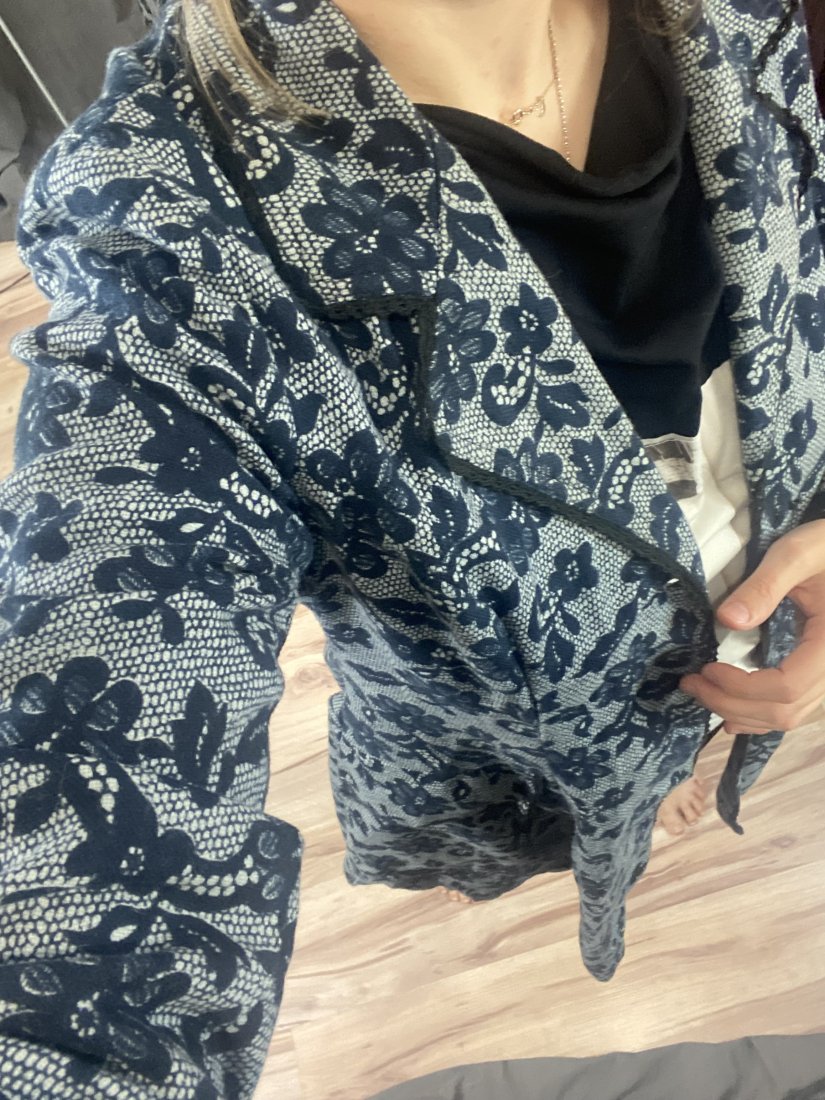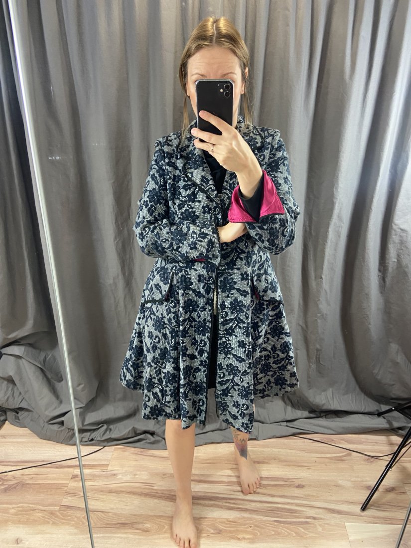 Przepiękny płaszczyk bawełniany, marki nomads. Płaszcz posiada satynową podszewkę. Wierzch 100% bawełna, podszewka satynowy poliester. Wykońćzony na szydełku.