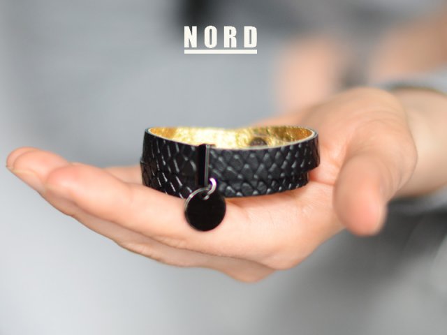 Surowość materiału, prosta forma, i odrobina lśnienia. to - NORD, bransoletka ze skóry naturalnej wysokiej jakości tłoczonej we wzór gada. Czerń. Elementy metalowe w kolorze grafitowym. Do podwójnego owinięcia wokół nadgarstka. Obwód po zapięciu 17 cm. Zapinana na zatrzask w kolorze grafitowym. Elementy metalowe wysokiej jakości. Wewnątrz wykończona złotą skórą. Lekka i wygodna. Ładnie układa się na nadgarstku. W zależności od ustawień monitora, kolory w rzeczywistości, mogą nieznacznie różnić się od przedstawionych na zdjęciu. © wzór chroniony prawem autorskim Opatrzona metką projektanta.