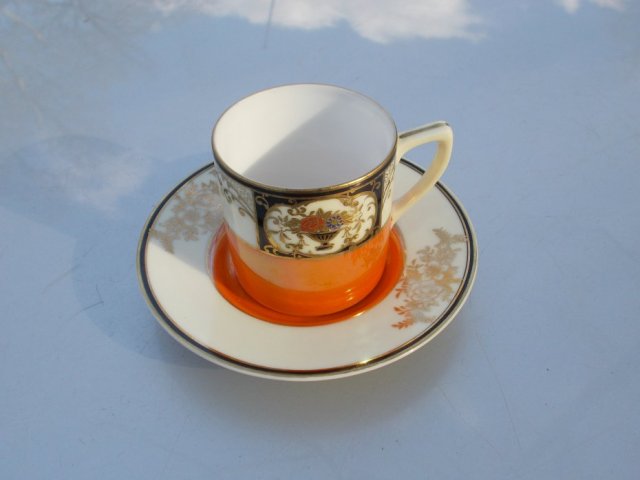 Pięknie zdobiona filiżanka ze spodkiem z cienkiej, szlachetnie prześwitującej porcelany, sygnowana NORITAKE Made in . Japan. Eleganckie złocenie, w części ręcznie malowane, na stosownie bogate :) Biel i kremowe ecru z kroplą wanilii, oraz ognisty pomarańcz.
