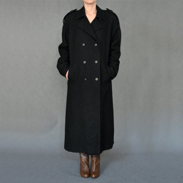 Piękny, czarny płaszcz vintage w całości z wełny. Solidny, ciężki i cieplutki. Krój prosty z kieszonkami po bokach i ozdobnymi guzikami. Na ramionach patki.