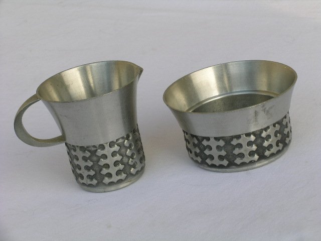 Duet cukierniczki z mlecznikiem słynnej norweskiej marki Pewter - sygnowany. Klasyk z połowy wieku. Po skandynawsku zdobiony. Oryginał. Cukiernica 8 x 4 cm. Mlecznik 8,5 x 6,5 cm. Stan zachowania dobry.
