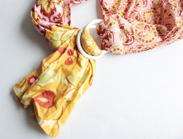 Miękki, duży szal z różnorodnych tkanin. Jest to prawdopodobnie nosidełko dla dziecka, jednak można nosić również jako klasyczny szal wykorzystując koła jako fantazyjne zapięcie. Materiał to prawdopodobnie bawełna.