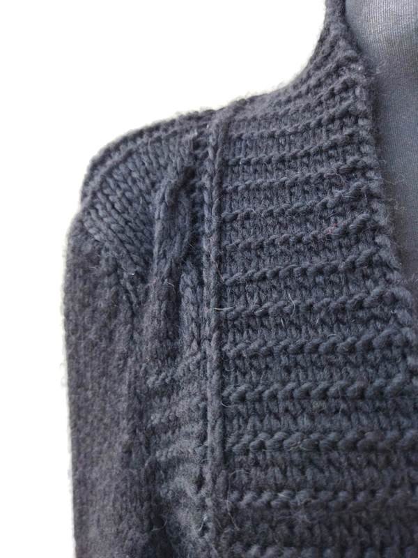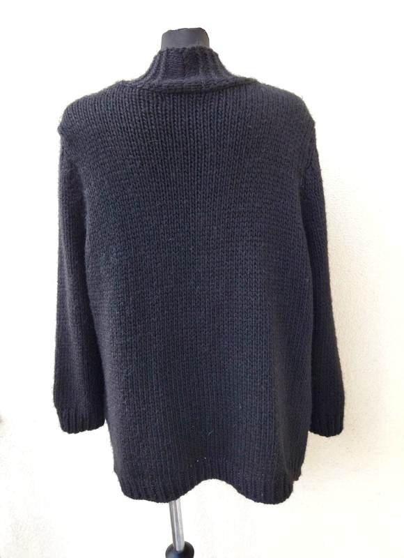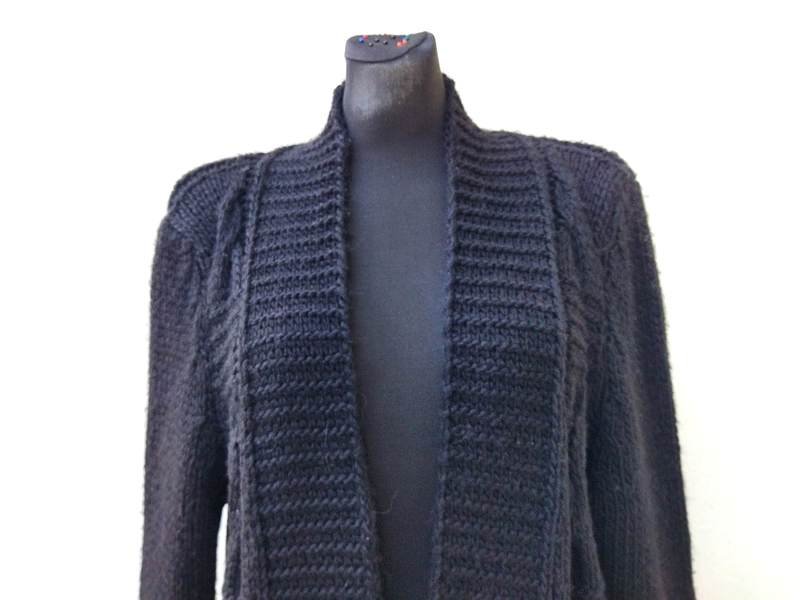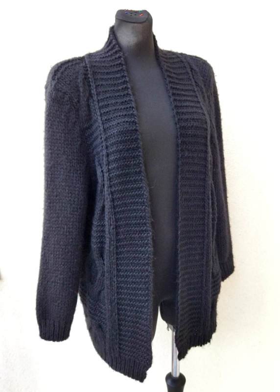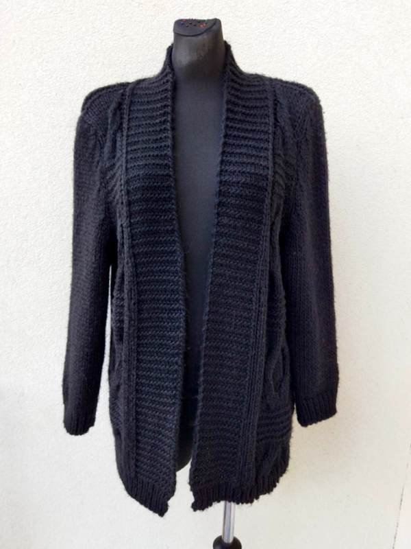 Miły, mięciutki sweter z grubej akrylowej włóczki z domieszką wełny i alpaki, w czarnym kolorze z warkoczowym wzorem z przodu. Fason otwarty bez zapięcia. Wykończony sciągaczami