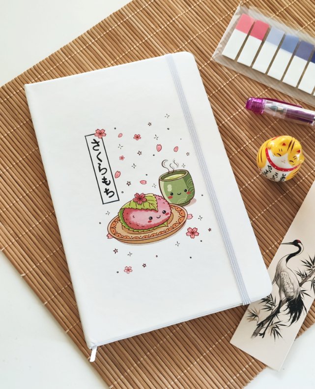 Uroczy notes w stylu kawaii z japońskim ciasteczkiem mochi oraz czarką herbaty matcha. Napis na notesiku wykonany japońską hiraganą to właśnie "sakura mochi", czyli ciasteczko tradycyjnie spożywane na wiosnę w okresie kwitnienia kwiatów wiśni. Wzór notesu to autorski projekt własny. Notes ma delikatną barwę złamanej bieli (kremową), a w środku strony w pomarańczowe linie. To piękny codzienny dodatek dla miłośników Japonii oraz wspaniały prezent dla bliskiej osoby.