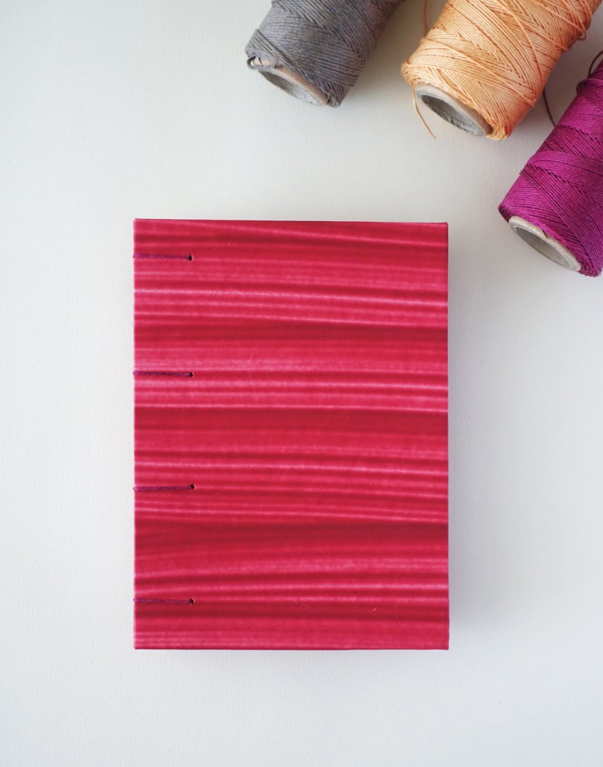 Notes w pełni i od podstaw wykonany ręcznie – od cięcia i składania papieru, poprzez wykonanie okładki i dekoracyjnego papieru oraz zszycie notesu lnianymi nićmi w jedną całość za pomocą tradycyjnego, dekoracyjnego ściegu.
