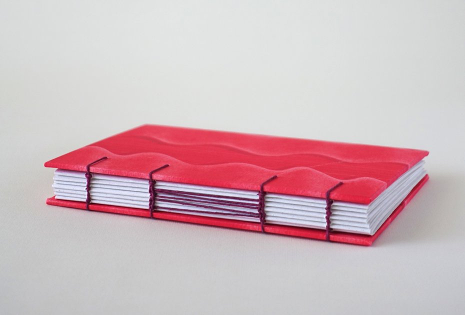 Notes w pełni i od podstaw wykonany ręcznie – od cięcia i składania papieru, poprzez wykonanie okładki i dekoracyjnego papieru oraz zszycie notesu lnianymi nićmi w jedną całość za pomocą tradycyjnego, dekoracyjnego ściegu.