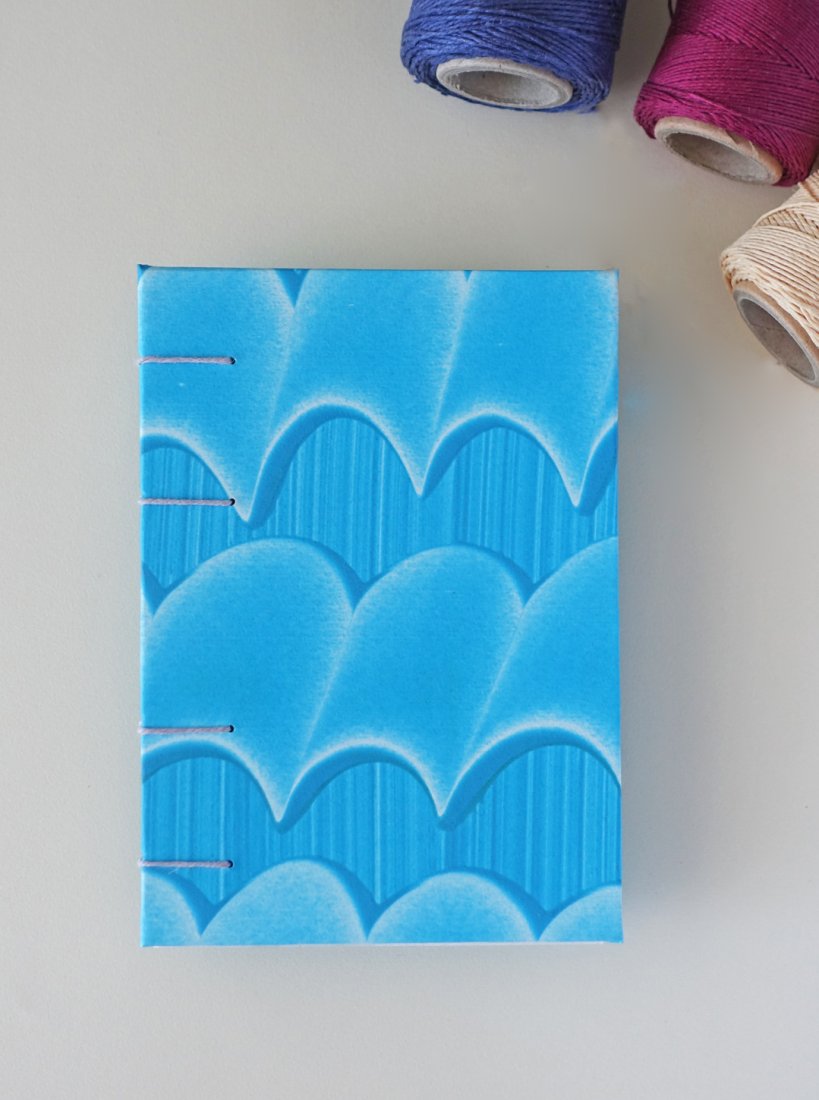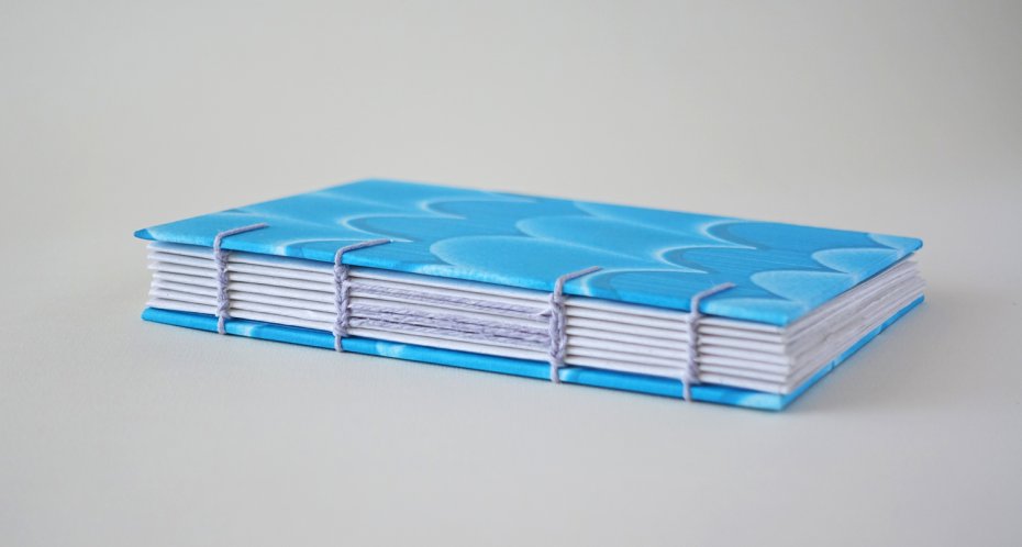 Notes w pełni i od podstaw wykonany ręcznie – od cięcia i składania papieru, poprzez wykonanie okładki i dekoracyjnego papieru oraz zszycie notesu lnianymi nićmi w jedną całość za pomocą tradycyjnego, dekoracyjnego ściegu.