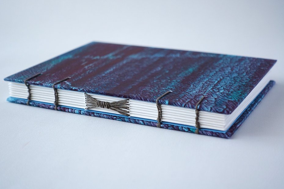Notes w pełni i od podstaw wykonany ręcznie – od cięcia i składania papieru, poprzez wykonanie okładki i dekoracyjnego papieru oraz zszycie notesu lnianymi nićmi w jedną całość za pomocą tradycyjnego, dekoracyjnego ściegu.