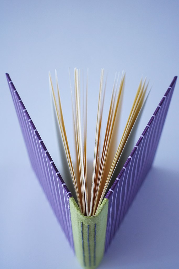 Notes w pełni i od podstaw wykonany ręcznie – od cięcia i składania papieru, poprzez wykonanie okładki i dekoracyjnego papieru, pokrycie grzbietu lnianym płótnem oraz zszycie notesu w jedną całość lnianymi nićmi.