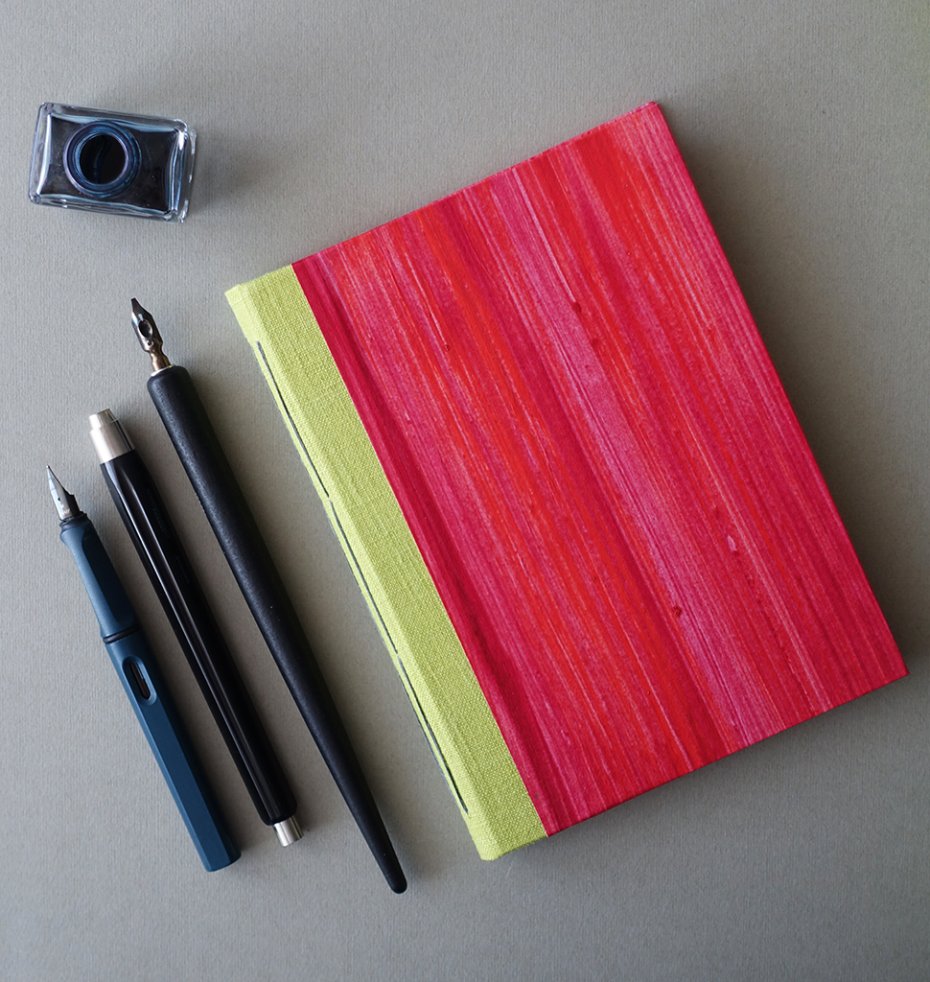 Notes w pełni i od podstaw wykonany ręcznie – od cięcia i składania papieru, poprzez wykonanie okładki i dekoracyjnego papieru, pokrycie grzbietu lnianym płótnem oraz zszycie notesu w jedną całość lnianymi nićmi.