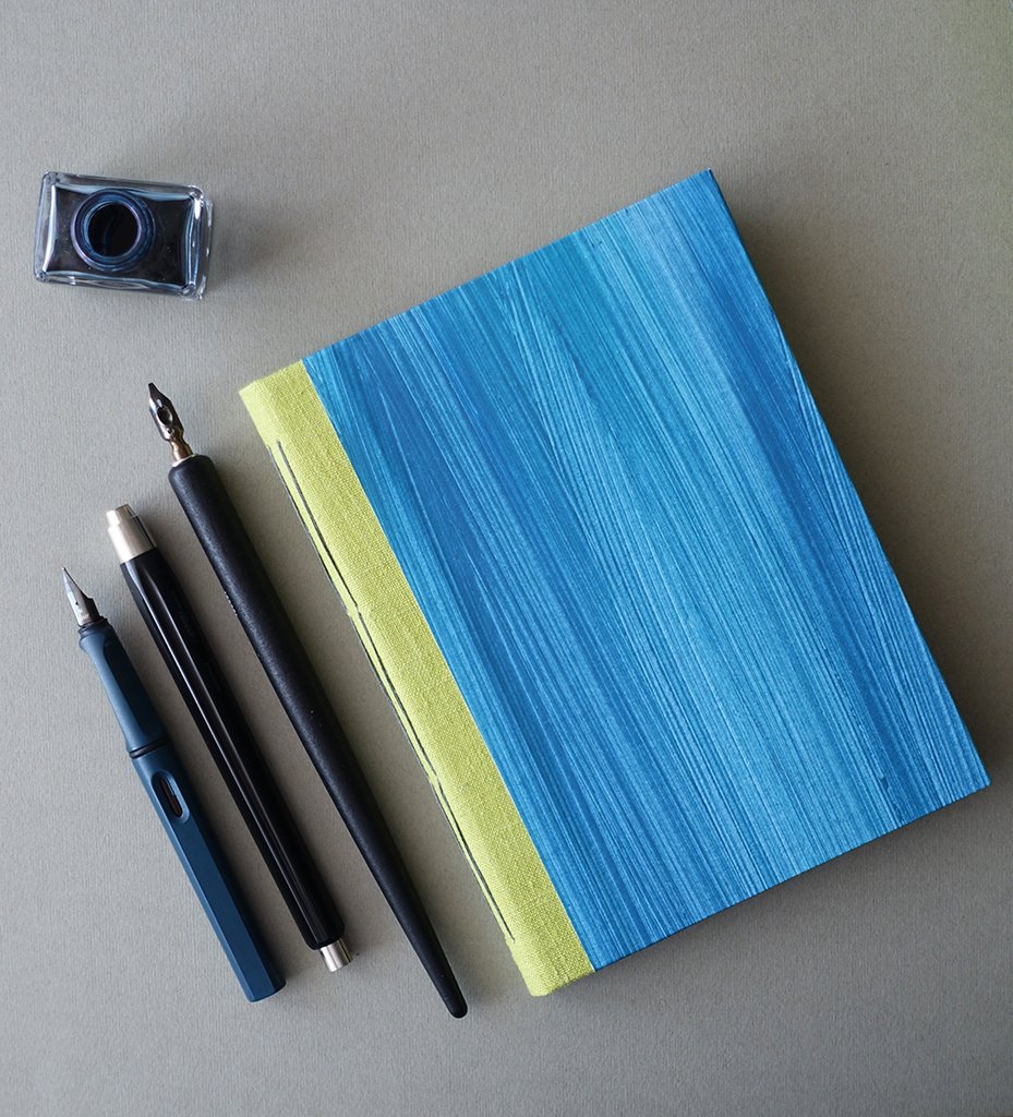 Notes w pełni i od podstaw wykonany ręcznie – od cięcia i składania papieru, poprzez wykonanie okładki i dekoracyjnego papieru, pokrycie grzbietu lnianym płótnem oraz zszycie notesu w jedną całość lnianymi nićmi.