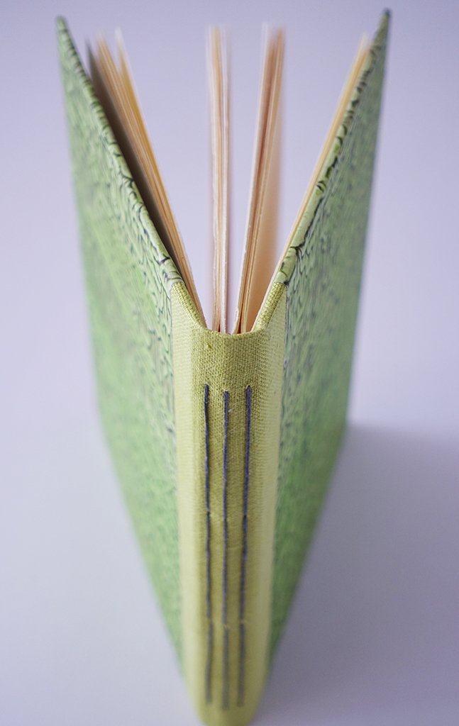 Notes w pełni i od podstaw wykonany ręcznie – od cięcia i składania papieru, poprzez wykonanie okładki i dekoracyjnego papieru, pokrycie grzbietu lnianym płótnem oraz zszycie notesu w jedną całość lnianymi nićmi.