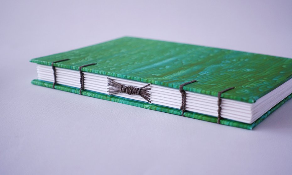 Notes w pełni i od podstaw wykonany ręcznie – od cięcia i składania papieru, poprzez wykonanie okładki i dekoracyjnego papieru oraz zszycie notesu lnianymi nićmi w jedną całość za pomocą tradycyjnego, dekoracyjnego ściegu.