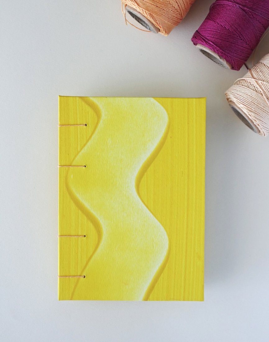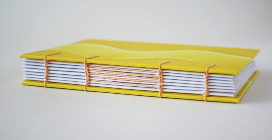 Notes w pełni i od podstaw wykonany ręcznie – od cięcia i składania papieru, poprzez wykonanie okładki i dekoracyjnego papieru oraz zszycie notesu lnianymi nićmi w jedną całość za pomocą tradycyjnego, dekoracyjnego ściegu.